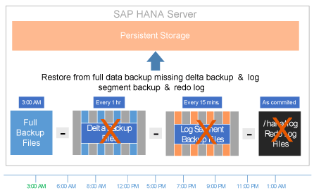 In this scenario, only the completed backup that started at 3:00 a.m. can be used to restore the data. Therefore, you can recover the data only up to that time. This scenario is very unlikely because you should also have the log-segment backups available. It is mostly used when transporting data from one SAP HANA system to another—for example, if I restore my production data to my development system for testing purposes.