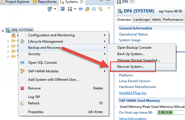 To start the recovery process using SAP HANA studio, right-click your system, click Backup and Recovery, and then click the Recover System… option (Figure 12).