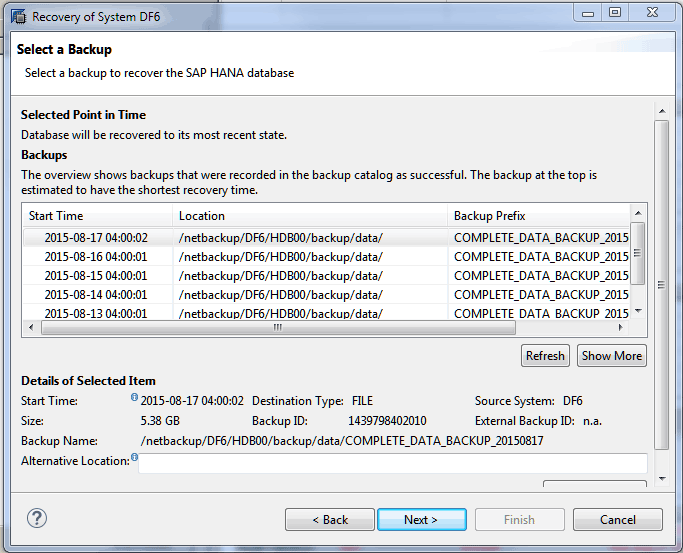 The system will default to the location configured within the SAP HANA studio backup console. If the files have been moved from their default location, you need to ensure that the correct path is specified, that the path is accessible by the SAP HANA server, and that the SAP HANA <SID>ADM OS account has ownership of the files. For more information, consult your Linux OS administrator. If the correct path is specified, click the Next button to proceed to the next window.