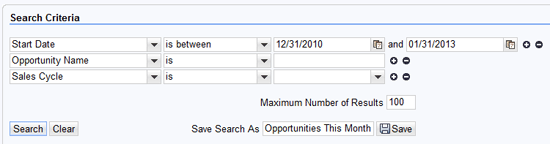 Here’s an example of how the saved search functionality works. Suppose a user is responsible for reviewing all opportunity records that have a start date within the previous month. By selecting the Start Date field in the CRM WebClient UI, using the operator is between, and specifying a date range, the system quickly locates the records that match these parameters. Because this is a frequently used search, the user enters the name Opportunities This Month and clicks the Save button to make it a saved search (Figure 1).