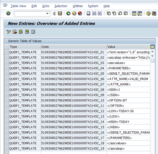 To create the required ZVALUE entries, simply copy the ABAP output starting at <?xml version=“1.0” and paste it into the Value column (Figure 7). Use QUERY_TEMPLATE as the Type for this set of records and paste the GUID of the query into the Code column. Notice that a serial number has been appended to the GUID in each line of the code. This provides you with a unique key for each row of the table, and it allows you to retrieve the lines of the query template in their proper order later. Note that the <LOW> and <HIGH> tags have been modified before they are saved to the ZVALUE table. The static dates of 20121205 and 20130204 have been replaced by the placeholders TODAY and TODAY-30.