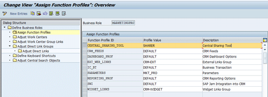 Before you can use the Central Sharing Tool, users must be assigned to a CRM WebClient UI business role that includes the function profile CENTRAL_SHARING_TOOL (such as the MARKETINGPRO role shown in Figure 8). You can view the settings for the CENTRAL_SHARING_TOOL function profile in the IMG. (Note that modifying the default settings is beyond the scope of this article.) The menu path is SAP Customizing Implementation Guide > Customer Relationship Management > UI Framework > Technical Role Definition > Define Function Profile (Figure 9).