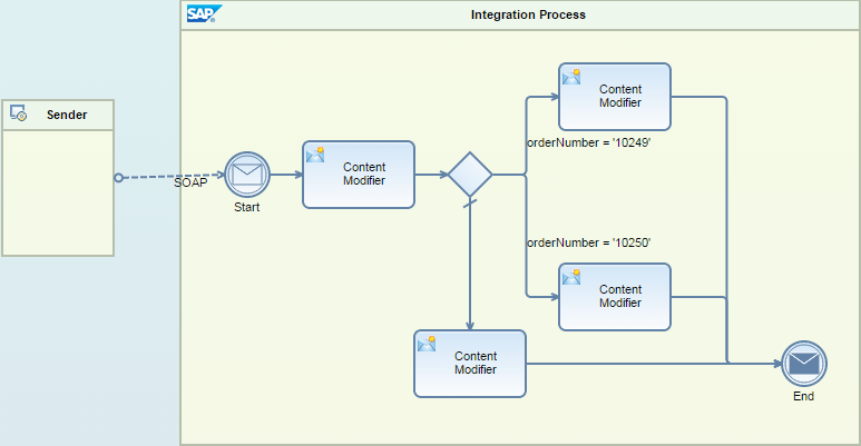 Figure 1). It is modeled using a Business Process Model and Notation (BPMN) exclusive gateway (the diamond shape). As you know from the first article, the whole modeling environment of SAP HCI is based on BPMN.