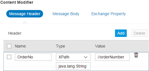 The incoming message starts the integration flow on the SAP HCI server. The first Content Modifier step takes the order number from the message and stores it in the message’s header area. The Content Modifier’s configuration is depicted in