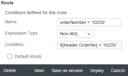 Figure 1. The Expression Type drop-down list is important. It contains the values XML and Non-XML. The selected value influences the way the Condition field is interpreted by the execution engine during run time. If XML is chosen, the condition is interpreted as an XPath expression. If Non-XML is chosen, it is interpreted as an expression using Camel variables.
