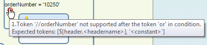 You can easily identify the typical Camel syntax for accessing variables (dollar sign, curly brackets). The header part of the variable’s name indicates the area from which you want to load the value (the message’s header area). The OrderNo part after the dot indicates the name under which you stored the value previously. Note that the Expression Type drop-down list has been changed to Non-XML. Because you define by this drop-down list how the Condition string will be interpreted, it should be clear that you cannot mix XML-based variables with Camel-based variables. If you try to mix them (e.g., ${header.OrderNo} = '10250' or //orderNumber = '10251'), you get a validation error (see