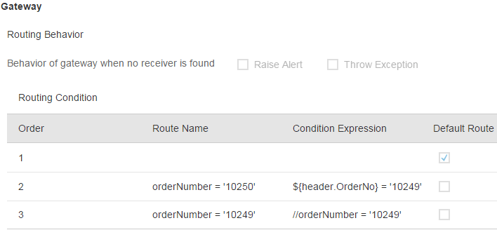 Let’s try a little experiment. You can change the conditions in such a way so that they overlap. In my case I change the condition of the gate labeled with orderNumber = '10250' to ${header.OrderNo} = '10249'. This obviously overlaps with the gate already labeled with orderNumber = '10249' and its condition //orderNumber = '10249' (compare with descriptions above). Both are checking against order number 10249. Once done, save your changes, deploy them, and run the scenario again using 10249 as the input value for the order number.