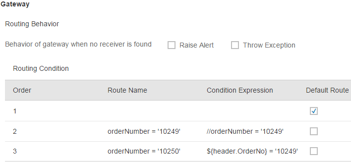 You see an example for the second case when you define the other gate, but first stick with the XML case. Obviously the condition is formulated using a classical XPath expression. You can also combine several expressions using the logical operators ‘and’ and ‘or’ (e.g., //orderNumber = ‘10249’ or //orderNumber = ‘10250’) to formulate more sophisticated routing logic.