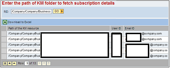 I developed a tool that allows you to retrieve user data such as email, UME login ID, user first and last name, KM resource URL, and subscription data for any file and folder in KM. I’ll describe KM APIs, services, and users involved in using a third-party portal for document storage so you can make KM lean and fast. You can download the data in an Excel sheet that you can use as an input to the standard SAP NetWeaver Portal WebService as an extended application of this tool.