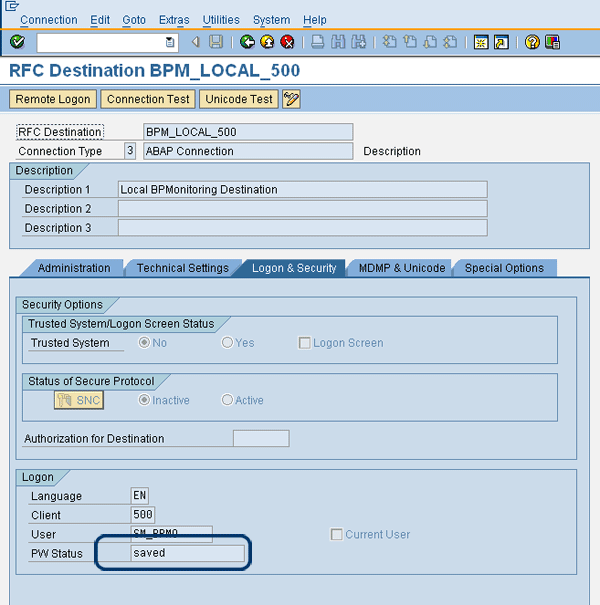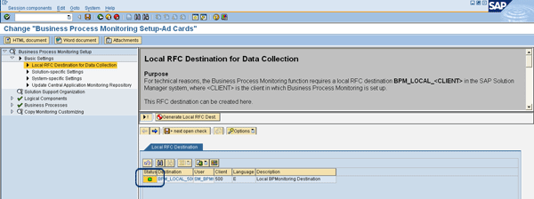Data collection monitoring in the satellite systems is triggered by the AutoABAP program SAPMSSY6. It runs in client 000 of SAP Solution Manager and is executed by the standard user SAPSYS. This user is not authorized to call other systems by RFC, and cannot collect data in parallel by RFC, so use the RFC destination BPM_LOCAL_500 (created during BPM setup in SAP Solution Manager). This RFC destination points from client 000 to client 500. The task of calling the satellite system and triggering data collection here is transferred to the user maintained in the RFC destination BPM_LOCAL_500. This user must have the necessary authorization (profile S_CSMREG).