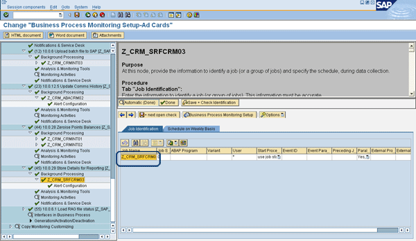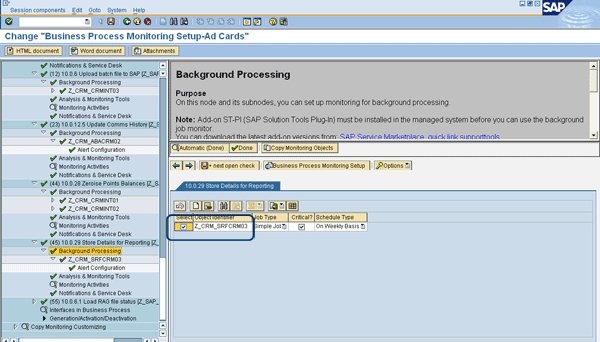 In Figure 14 you see the screen for the Background Processing node. Add the batch jobs you want to monitor. Type the name of the batch job (e.g., Z_CRM_SRFCRM03) in the Object Identifier field.