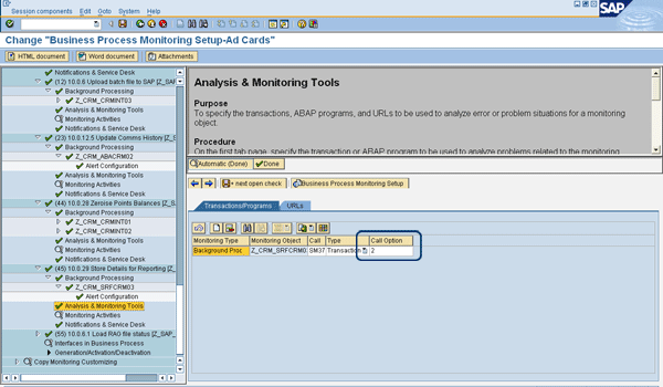 In the Analysis & Monitoring Tools node, specify the transactions, ABAP programs, and URLs to be used to analyze error or problem situations for a monitoring object. Later I’ll show you how you can use these transactions, programs, and URLs to help solve the problem. Here you use the default transaction SM37.