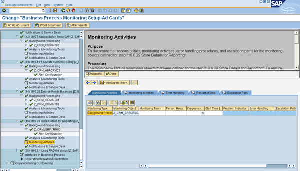 In the Monitoring Activities node, you can document the responsibilities, monitoring activities, error-handling procedures, and escalation paths for the monitoring objects (Figure 19). The table on the right in the Monitoring Activities tab lists all monitoring objects that were defined. To ensure effective monitoring and efficient problem resolution, you need to make sure responsibilities are assigned, and that problem resolution procedures are defined.