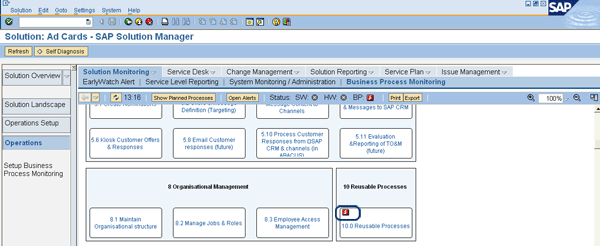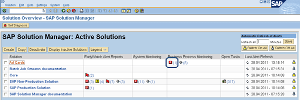 As a next step, you access BPM in SAP Solution Manager using transaction DSWP. Look at the applicable Solution and click the red icon that shows the number of business processes that are producing errors (Figure 24).