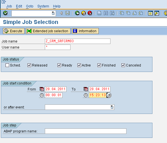 Look for the job that has been cancelled (Figure 27). You can filter by selecting different check boxes under Job status. Then click the Execute button to bring up the screen in Figure 28. You can perform analysis on batch jobs that meet your selection from the previous screen.
