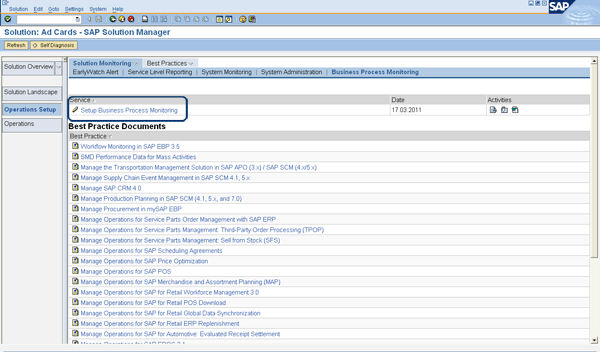 First, use transaction DSWP and select a solution in which the BPM is needed (Figure 5). Then click the Setup Business Process Monitoring link (Figure 6). This brings up the screen in Figure 7.