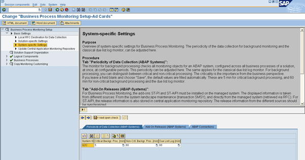 In the beginning, you added the RFC connection with the appropriate user, so in the screen in Figure 7 you need to check that the green light appears. Click the System-specific Settings text on the left to see the help text on the right (Figure 8). For certain BPM scenarios (e.g., if you require different periodicity of data collection), you might need to make changes here, so make sure you read the help text.