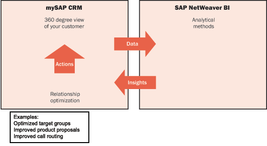 As you can see in Figure 1, mySAP CRM provides data to SAP NetWeaver BI, which processes the data and returns the analyses to mySAP CRM. This return of data from SAP NetWeaver BI to mySAP CRM is prevalent in many areas. It could be a simple feed of a target group generated by manual data analysis, or it could be the output of complex data mining algorithms based on millions of sales orders.