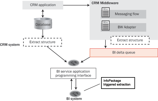A simplified version of the BW Adapter interface appears in Figure 2. CRM delivers an extraction mechanism to feed data into SAP NetWeaver BI from all CRM application areas. In many cases, the system stages this data to SAP NetWeaver BI (the delta queue) with exactly the data it saved in the mySAP CRM transaction at the time it processed it.