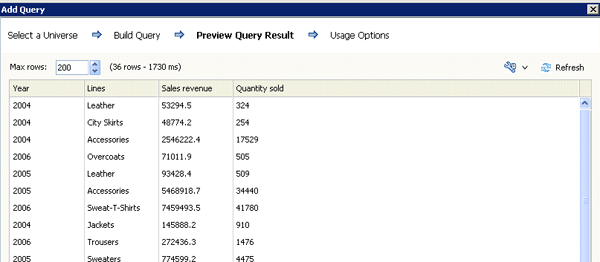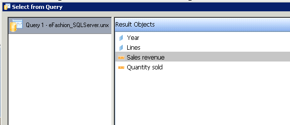 Step 7. In the next screen, select the dimension and key figures you would like to include in your SAP BusinessObjects Dashboards object. In my example (Figure 3) I am using the dimension Year and Lines and the key figures Sales revenue and Quantity sold in the Result Objects section.
