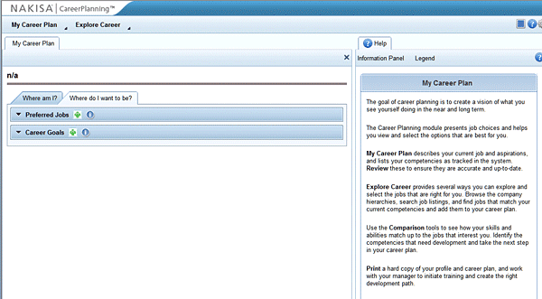 - Where do I want to be? This identifies positions that are of interest to the employee. Using the Explore Career option, employees can search job listings, explore by job hierarchy, select jobs that match their competencies, and add to their career plan.