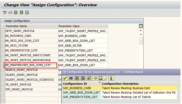 You can also enhance the content being displayed in the list zoom-in box for open assessment. Follow menu path SPRO > Talent Management and Talent Development > Basic Settings > Adjusting the user interfaces > Configurations for data retrieval > Assign configuration for user interface. In that table, assign the required values to the parameter RM_UNAPPRAISED_BOX_ZOOM_LIST (see Figure 5 for possible values that can be assigned).
