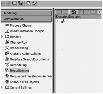 In my example, I have three partitions in the format of year/period: 2008012, 2008011, and 2008010 for the InfoCube Demo Cube. Start the repartition function by activating transaction RSA1. In the main Administration Workbench screen that appears, select the Administration Function Area from the left panel. The screen changes to show all the available options, including Repartitioning (Figure 1).