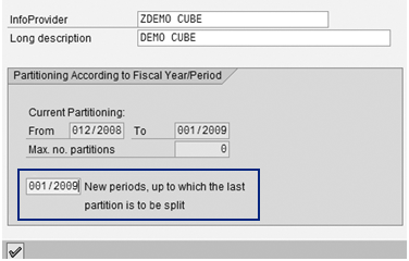 In my example, the range of the partition is fiscal year/period 001/2008 to 001/2009 with 13 as the maximum number of partitions. With this repartitioning, the parameters should split the datasets into 13 periods from 001/2008 to 001/2009 (Figure 7). Return to Figure 2, select the Complete Repartitioning option, and then click on the Initialize button.