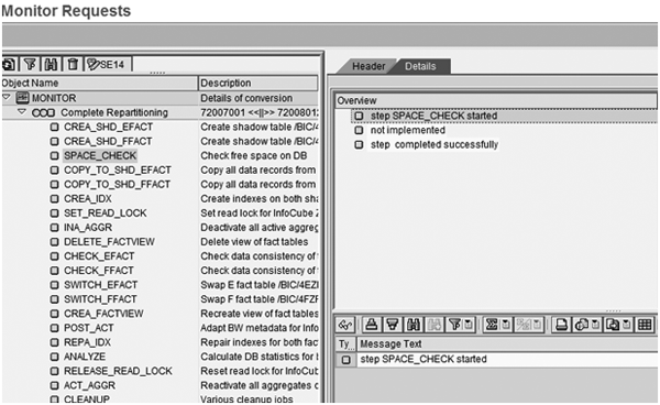 You can monitor and review logs of the repartitioning process via the SAP Monitor Request function. In Figure 2, click on the Monitor button to bring up the screen in Figure 9. The Monitor Requests screen provides a detailed log and the tasks of all the repartitions executed for a specific InfoProvider. The left side contains the processing steps. The right side contains the details and messages for each task. For example, if you choose the Complete Repartitioning option, the monitor provides detailed steps (e.g., development of tables, verification of disk space, index, and cleanup) and logs for the identified InfoProvider.