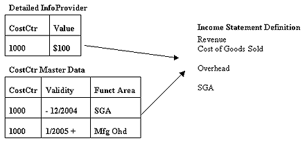 Let’s consider reporting on the cost center (CostCtr 1000) depicted in Figure 5. Previously, it was a component of the sales, general, and administrative expenses (SG&A) functional area, but on January 1, 2005 it will be restated as part of the manufacturing overhead. The restatement requires all costs associated with CostCtr 1000 to move above the gross margin in the income statement per 2005 format. My solution is to keep the relationship between CostCtr 1000 and SG&A through a validity date of December 31, 2004. At that time, a new entry is created in the cost center InfoObject relating CostCtr 1000 to the manufacturing overhead.