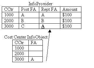 Let’s return to the income statement in Figure 5. We will use a virtual characteristic named “reported functional area” to define this report. Assume that there is a posted functional area from R/3 as well as a functional area associated with the cost center master data attribute. The structure is represented in Figure 6.