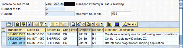 One of the key features of the simple transport method is that consolidated information about all released transports, including associated key identifiers and import or export status is stored in a single place — the ZTRTRACKING table. Therefore you can use transaction SE16N to query this data in multiple ways including by change request number, Object ID, Group ID, release number, transport owner, or transport number.