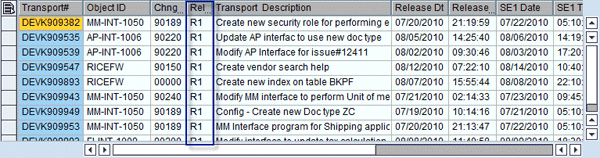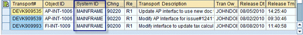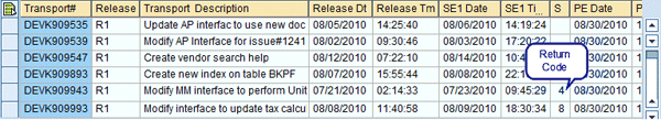 In addition, with each query, you not only see all relevant transports but also the transport description, transport owner, release date time from development, import date time, and return code from SE, QA, and Production in a single-line horizontal view (Figure 30). There is no need to use transaction SE09 and painfully retrieve transport logs one transport at a time.