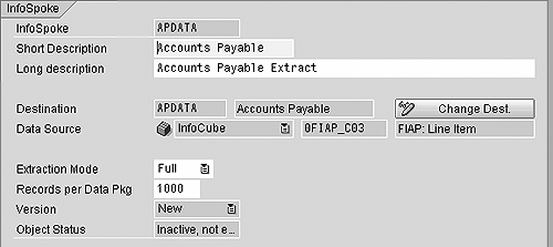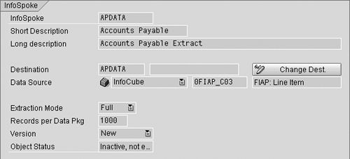 Go to the Create InfoSpoke screen using transaction code RSBOH1 or Administrator Workbench menu path Tools>Open Hub Service>Create InfoSpoke. Name the InfoSpoke and destination, and provide the DataSource information and extract mode. The source of the data can be an InfoCube, ODS object, or InfoObject (text or attribute). The extract mode can be full or delta, but delta mode is possible only for InfoCubes and ODS objects.
