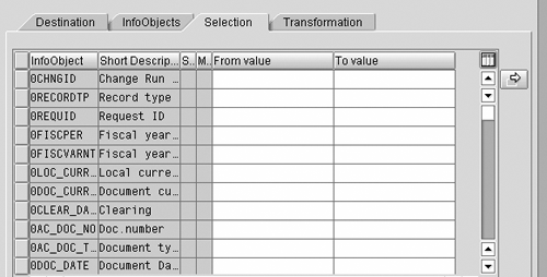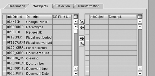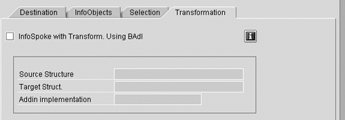 Click on the Transformation tab to transform the InfoObjects to be transferred using a Business Add-In (BADI).2 Use a BADI any time you need to transform the data prior to populating the extract file or table—for example, a date or currency conversion, or reading text with an InfoCube.