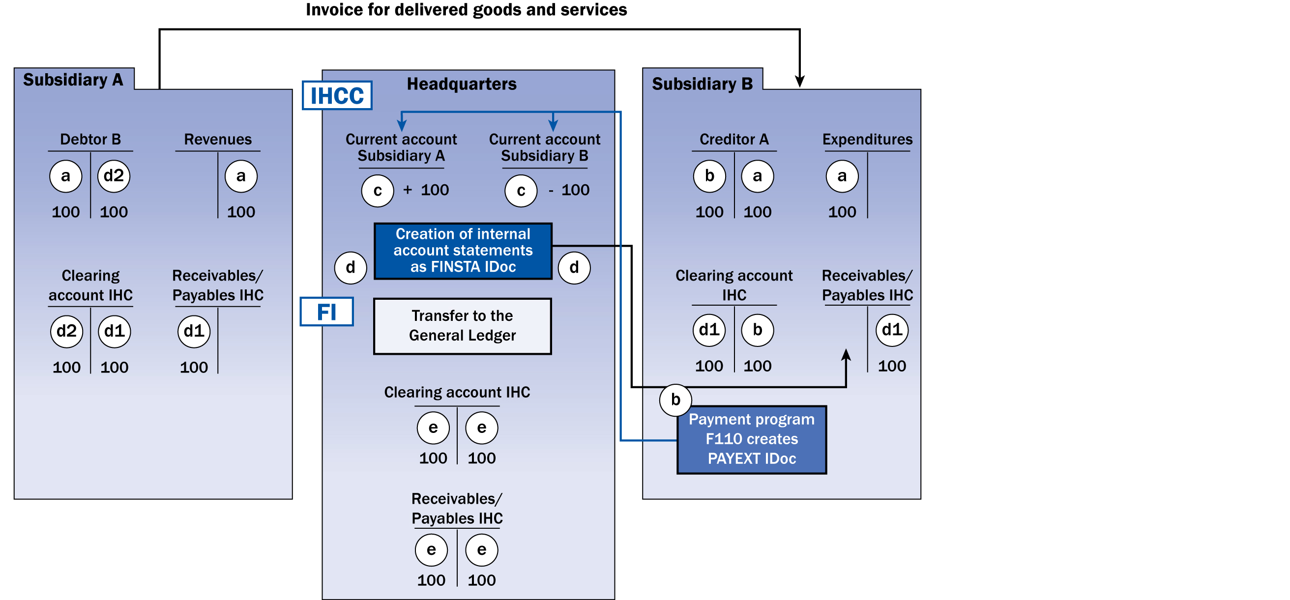 Step 1. Subsidiary A receives goods or services from an external business partner and an invoice. Subsidiary A posts this invoice to AP and initiates a payment run to clear the open item against a bank clearing account. The system creates a payment file with a PAYEXT IDoc and sends this IDoc to the IHCC (accounting record a).