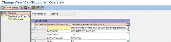 Step 1. Set web services: ID and description. Follow menu path IMG>Materials Management>Purchasing>Environment Data>Web Services: ID and Description (Figure 9). Specifying Web service, parameters, and call structure enables the activation of the catalog button in the purchase requisition and purchase order transactions. The key fields for the first screen are shown in Figure 9.