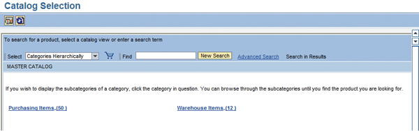 Take the example of a school district order requisitioning process. In this scenario, the requisitioner is required to order a significant number of items, such as textbooks, on a periodic basis for a number of schools. The shopping cart functionality improves the productivity and accuracy of requisition creation in ECC, which is significant because there could be more than 100 textbooks for each school that need to be ordered from the warehouse. With the catalog functionality, the user picks the items from a catalog without searching for items individually with the material search or manually entering them in ECC. The catalog enables the selection of multiple items at one time for further processing. This functionality is valuable in a process in which there are significant numbers of items to order internally or externally.