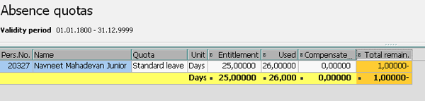Time quota in SAP ERP HCM refers to an employee’s leave entitlement. An HR time administrator generates and awards leave entitlement to an employee on a daily, monthly, or yearly basis, depending on an organization’s business rules. As of SAP R/3 4.0B, users store employee absences in infotype 2001 and enter available absence quotas or leave entitlement in infotype 2006. If (as is commonly the case) an employee exceeds his absence quota entitlements, companies need to be able to effectively and efficiently manage it in the system without a lot of time and effort. Negative quotas allow employees to exceed their stated entitlements.