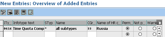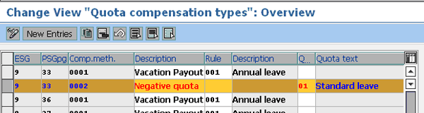 Enter the relevant employee subgroup (ESG) and personnel subgroup (PSGpg) groupings shown in Figure 6. The ESG grouping refers to an employee subgroup grouping for time quota types. It is a grouping of employee subgroups for which the same absence and attendance quota types are defined. The PSGpg grouping refers to a grouping of personnel subareas for time quota types. It is a division of personnel subareas for which the same absence quota types and attendance quota types are defined. The compensation method (Comp. meth.) refers to a time quota compensation method (compensation method for short) that forms the subtype for infotype 0416. In this example, I use 9 for the ESG for my Russian ESG configuration. The compensation method is 0002 for Negative quota. Choose the relevant quota type (here it is 01 for Standard leave) and click the save icon.