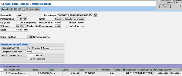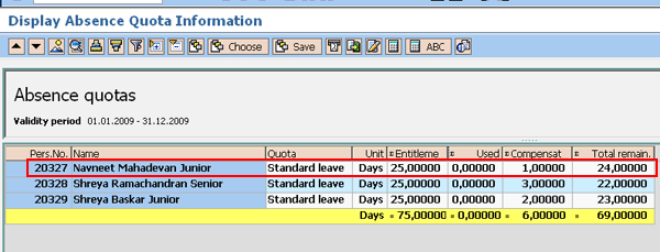 Now enter 1 in the No. to compensate field, and click the save icon. If you check infotype 2006 for this employee for the 2009 quota, the system shows the deduction of one day (Figure 8).