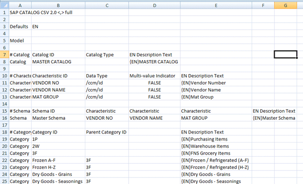 Figure 2 shows a sample CSV upload file for the master catalog. The file only consists of the Model section that builds the structure of the catalog with categories and characteristics. This file cannot contain a content section with items. Items have to be mapped from a supplier catalog. For more detailed information on the CSV upload file structure, see https://help.sap.com/saphelp_ccm10/helpdata/en/44/f0da41e09b6324e10000000a1550b0/frameset.htm.