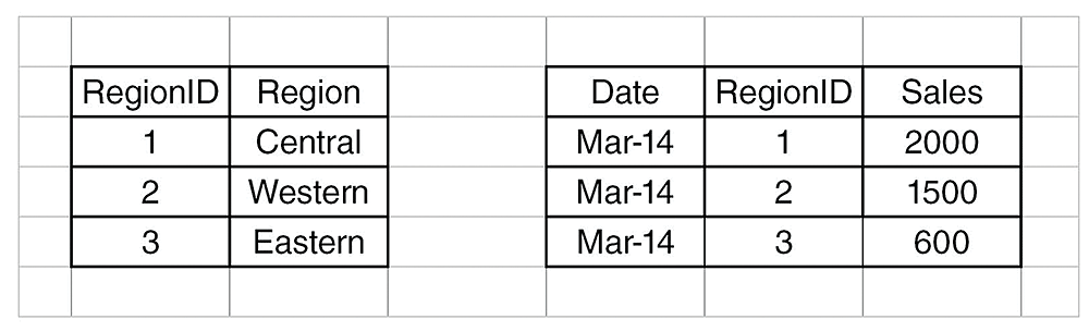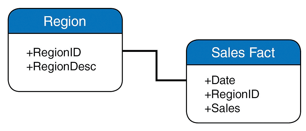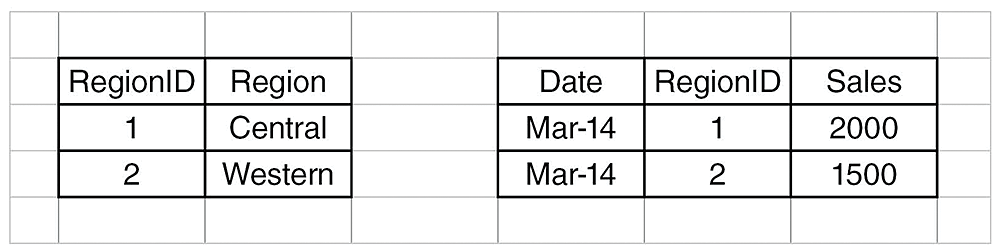 In this example, there is one fact table (a fact table in a star schema is the table that contains the ID referenced for other dimensions and all available metrics—in this example, Sales) and one dimension (Region). In the tables in Figure 2 you can see some example data to help you understand the star schema.