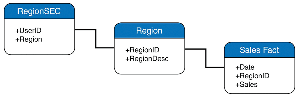 You can understand from this security table that Tmahmoud is only allowed to see information related to the central region, Maria can see the central and western regional information, and Pop can see all the regions’ information—central, western, and eastern. Now, let’s assume the following example star schema for sales information, shown in Figure 1.