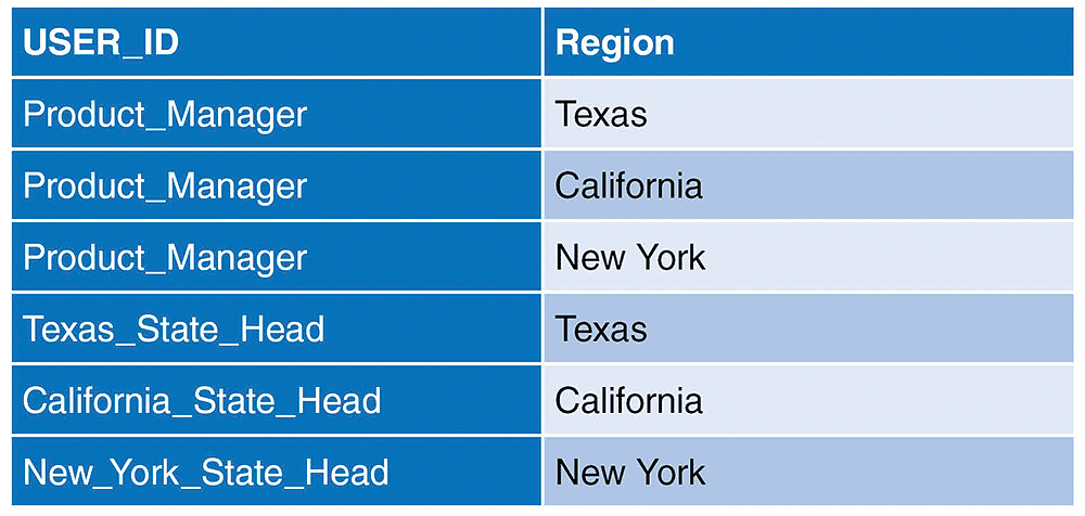 Based on the settings in the table in Figure 5, the product manager can see all States’ information (Texas, California, and New York), but each State head can only see his or her own State’s information.