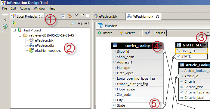 2. Double-click the eFashion data foundation (e.g., eFashion.dfx) to open it (2).