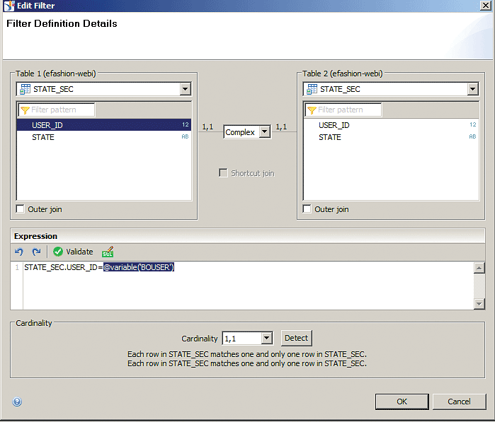 2. Open the Edit Filter pop-up (Figure 7) by double-clicking the join line (the line between the OUTLET_LOOKUP and STATE_SEC tables shown in Figure 6) and type the following expression in the join-definition box (under Expression): STATE_SEC.USER_ID = @variable(‘BOUSER’). Then click the OK button.