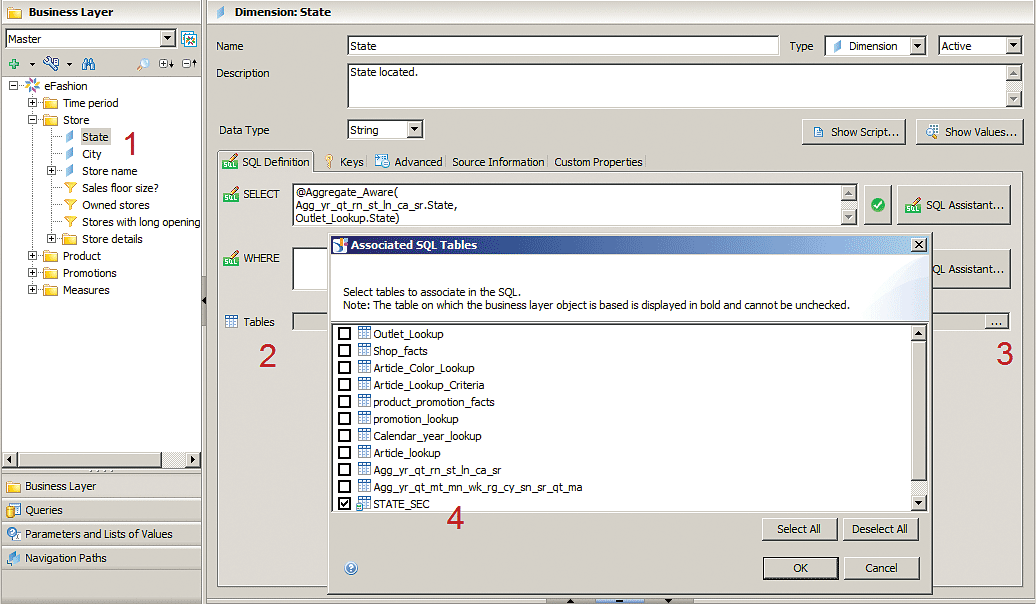 2. In the Dimension State screen that opens on the right of the figure, select the SQL Definition tab. Once in the SQL Definition tab (Figure 8), navigate to the Tables area (2).