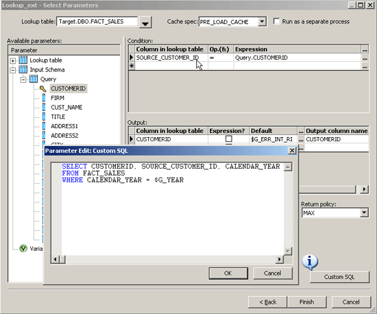 One more use case to consider with lookup performance is whether to cache a subset of data in the table. This is done two ways: First, select the PRE_LOAD_CACHE option in the screen in Figure 4, then use the Custom SQL button to generate custom SQL as shown in Figure 5.