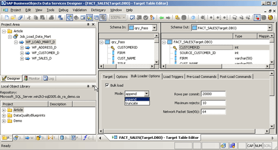 The Mode parameter exists simply to select either appending to the existing table, or truncating the data first, then appending new data. The Maximum Rejects parameter sets the threshold for the maximum number of violations that can occur against the target table before the job fails. The Rows per commit and Network Packet size parameters are the two most important options from a tuning standpoint. These two parameters must be used together to get the most performance out of bulk loading SQL Server. A good rule for Rows per commit is to set blocks of 20,000 records for a baseline. You can also set the Network packet size to accommodate the size of the data to fill the network packets as densely as possible with each transmission. I have seen good results with a 64 kilobyte network packet size. Start with these values and test with your data.